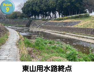 安祥寺川と山科川が合流するところが東山用水路の終点です。日ノ岡から西野山までの約5㎞の用水路です。今も農業用の水に使われています。
